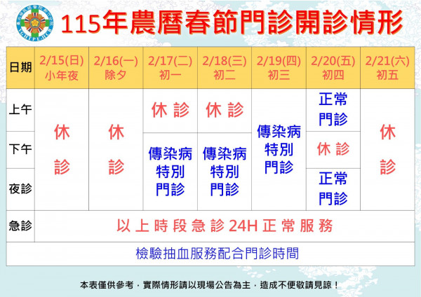 115年春節連續假期/門診時間: