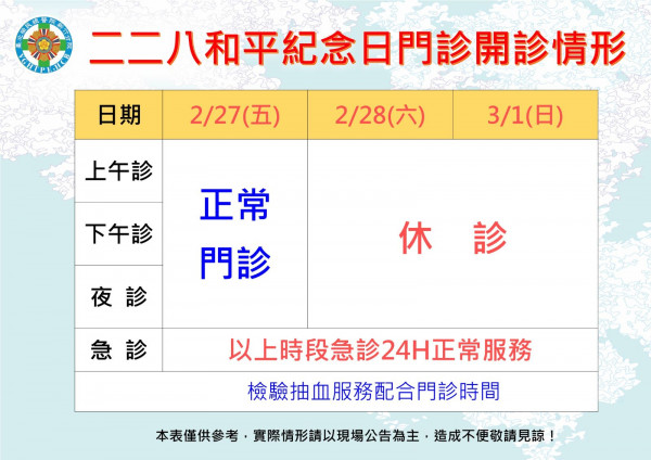 臺北榮總新竹分院 228假日門診時間說明如下: