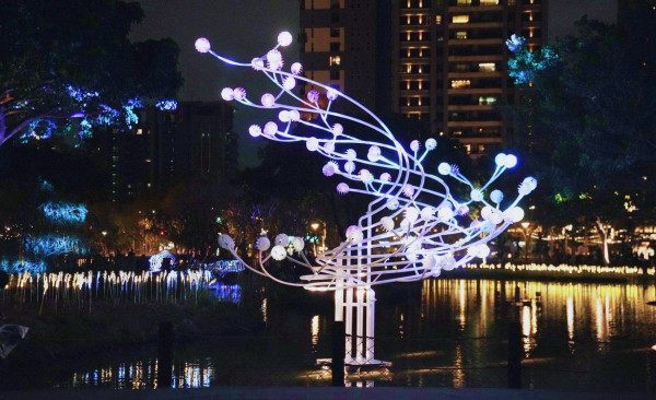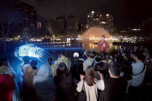 開春大新竹地區最受期待的藝術盛事「2026竹北光節 盛世之境」,於2月28日晚間在竹北水圳森林公園正式點燈。竹北市長鄭朝方、竹北市民代表會主席林啟賢、副主席葉信輝、多位代表、里長,以及贊助單位宏匯集團崔梅蘭總經理共同出席開幕儀式。雙主燈點燈後隨即展開高規格「水上音樂會」,與國際級台灣音樂家輪番獻藝,象徵「盛世之境」展演正式啟動。