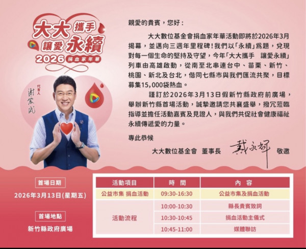 捐血活動從山城苗栗,熱血傳遞到風城新竹,這份溫暖將持續接棒到桃園、新北及台北等地。大大數位基金會誠摯邀請民眾,一起加入這場守護生命的「捐血嘉年華」,讓愛心不間斷,生命更璀璨。