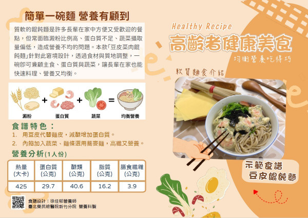 許多長輩在家中為求方便,常以簡單的乾拌麵或傳統餛飩麵打發一餐,卻往往落入「澱粉比例過高、蛋白質與蔬菜嚴重不足」的陷阱,長輩若長期蛋白質攝取不足,會加速肌肉流失,大幅增加跌倒與失能的風險。為了精準提升優質植物性蛋白的攝取量,營養師特別研發這款『豆皮菜肉餛飩麵』。將傳統麵粉製成的餛飩皮更換為豆皮,並在內餡中加入豆腐。這項調整讓每一碗可提供達近30公克的蛋白質,遠高於一般市售麵食,且熱量僅約 425大卡。透過「減醣、增肌」的組合,不僅能維持血糖穩定,更能在適當熱量下精準補足肌肉生長所需的營養。