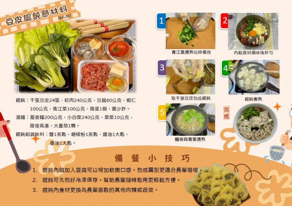 (二)省力備餐:長輩或家屬可利用週末預先包好餛飩冷凍保存,用餐時僅需與蕎麥麵同煮,加份青菜,十分鐘內即可享用營養均衡的一餐。