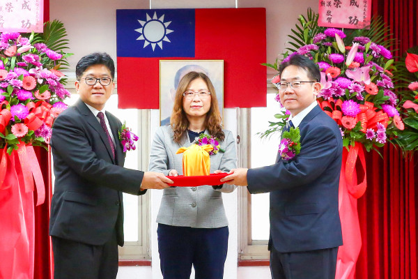 中華郵政股份有限公司王副主任委員婉如擔任監交人(中)、卸任吳進益局長(左)、新任局長沈佛龍(右)。